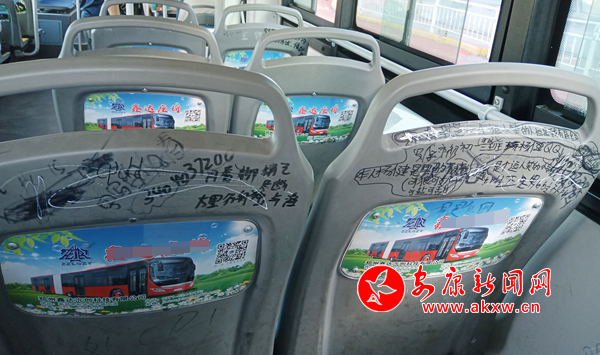 7月7日,筆者乘坐安康市城區(qū)7路公交車發(fā)現(xiàn),公交座椅靠背慘遭“涂鴉”,內(nèi)容不乏廣告標(biāo)語、低俗粗鄙、不堪入目的語言,嚴(yán)重影響乘車心情。希望廣大乘客文明乘車,還市民一個干凈整潔的乘車環(huán)境。(通訊員 成忠旭)siz安康新聞網(wǎng)