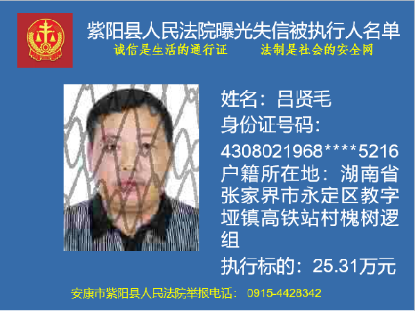 被執(zhí)行人呂賢毛,你因不履行(2017)陜0924民初241號民事判決書確定的義務(wù),已被紫陽縣人民法院納入失信被執(zhí)行人名單庫依法進(jìn)行信用懲戒。信用懲戒范圍包括但不限于以下措施: