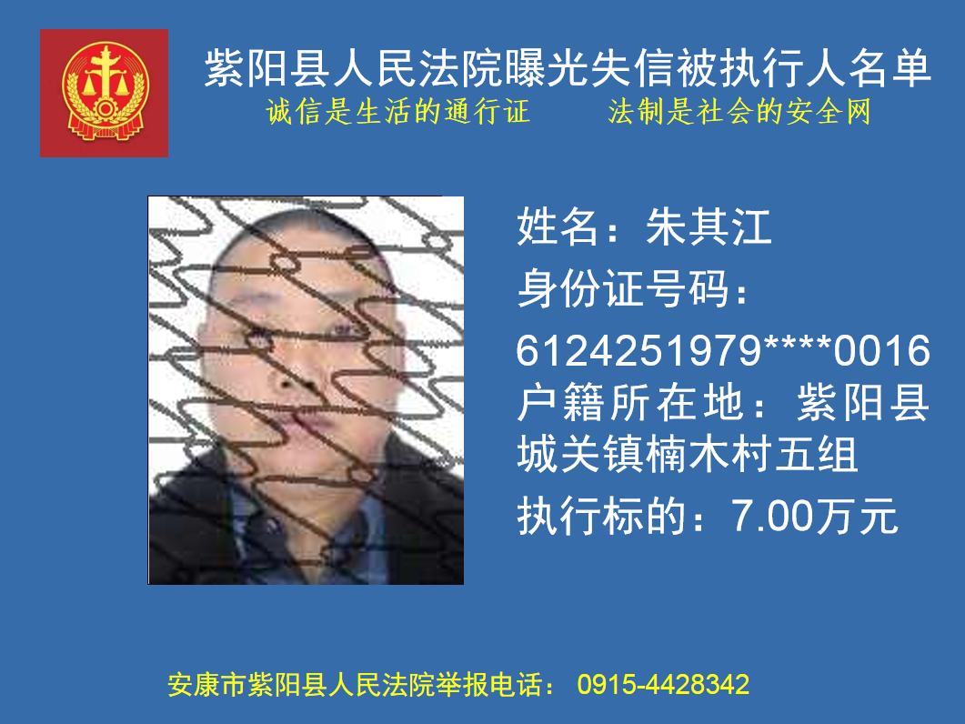 被執(zhí)行人朱其江,你因不履行(2017)陜0924民初241號(hào)民事判決書確定的義務(wù),已被紫陽縣人民法院納入失信被執(zhí)行人名單庫依法進(jìn)行信用懲戒。信用懲戒范圍包括但不限于以下措施: