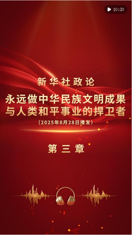 新華社8月28日播發(fā)《新華社政論|永遠(yuǎn)做中華民族文明成果與人類和平事業(yè)的捍衛(wèi)者——寫在中國(guó)人民抗日戰(zhàn)爭(zhēng)暨世界反法西斯戰(zhàn)爭(zhēng)勝利80周年之際》。我們邀請(qǐng)誦讀嘉賓吳樾演播“第三章”。