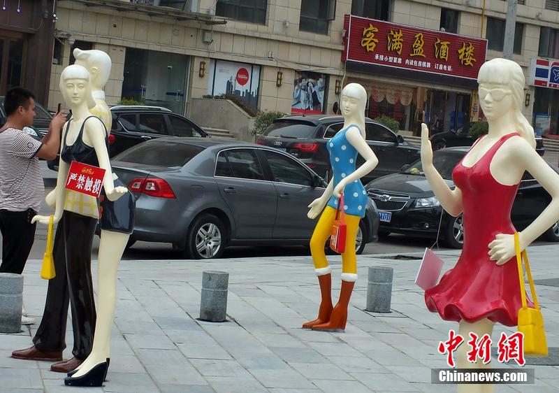 2014年8月6日,湖北宜昌市桔城路福久源商業(yè)街廣場(chǎng)上塑起4個(gè)嶄新的時(shí)尚模特塑像,其中3個(gè)“胸器”誘人的性感女模特塑像身上掛出了“嚴(yán)禁觸摸”提示牌!