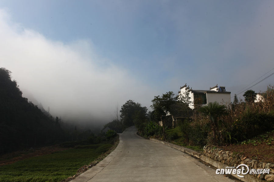 廣佛鎮(zhèn)鐵爐村,路邊的徽派民居在大巴山的云霧里靈動(dòng)飄逸。qua安康新聞網(wǎng)