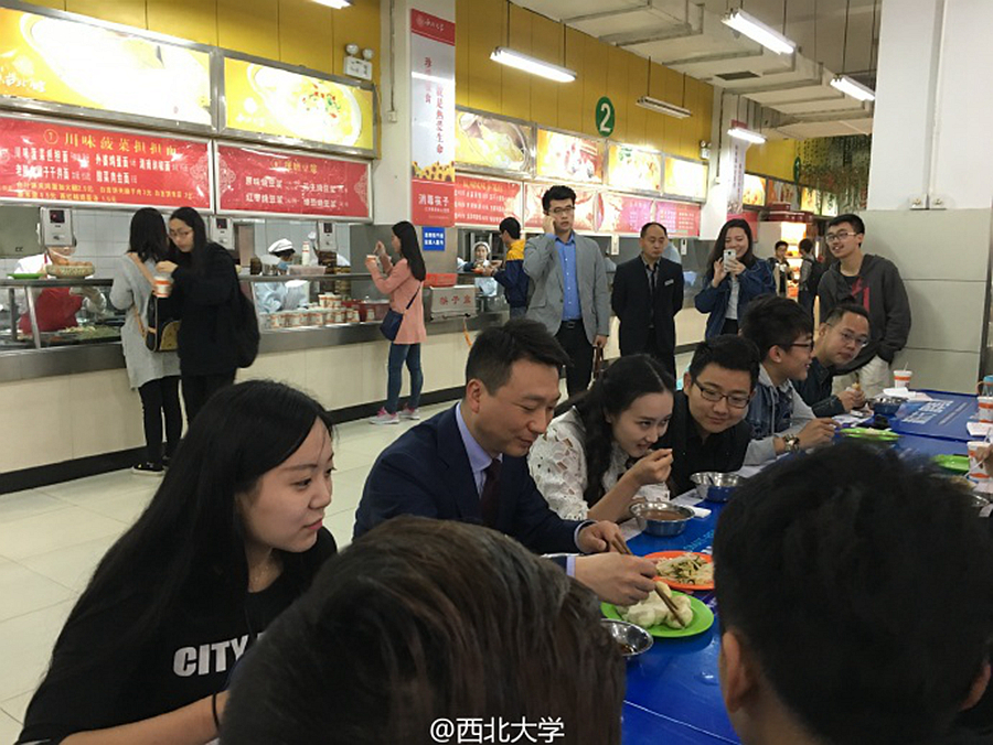 講座開始前,康輝還和同學(xué)們共進(jìn)早餐。他不斷夸贊早上的包子好吃。圖片來(lái)自@西北大學(xué)