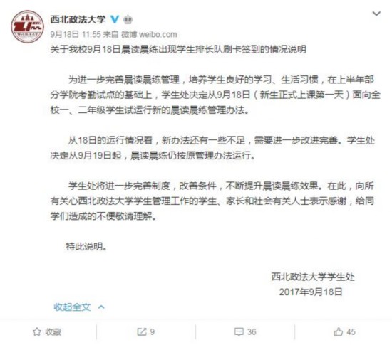 關(guān)于我校9月18日晨讀晨練出現(xiàn)學(xué)生排長(zhǎng)隊(duì)刷卡簽到的情況說(shuō)明