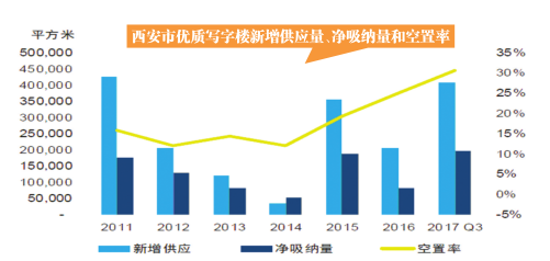 11月2日,房地產(chǎn)服務(wù)運(yùn)營(yíng)商戴德梁行發(fā)布今年第三季度市場(chǎng)報(bào)告顯示,隨著邁科中心等寫字樓入市,市場(chǎng)增加19.1萬(wàn)平方米的優(yōu)質(zhì)寫字樓面積,全市甲級(jí)寫字樓總存量接近195萬(wàn)平方米;全市凈吸納量累計(jì)值為85021平方米,其中高新區(qū)凈吸納量最高,為62110平方米。由于新項(xiàng)目入市,整體市場(chǎng)空置率升至30.58%,較上季度上升2.68個(gè)百分點(diǎn)。目前,西安寫字樓多集中于城市主干道沿線,同時(shí),新入市的寫字樓品質(zhì)均較高,進(jìn)一步提升城市寫字樓的整體水平。