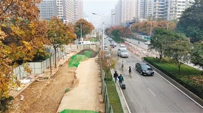 這里的圍擋給該路段的交通造成了一定的影響。記者注意到,從科技四路十字往南,圍擋占據(jù)了高新路西側(cè)整個(gè)非機(jī)動車道和部分人行道,35路公交站也被圍擋在內(nèi)。由北向南的非機(jī)動車和行人途經(jīng)此路段時(shí),不得不走上機(jī)動車道,與疾馳而過的各種機(jī)動車搶道。而高新路由北向南只有兩條機(jī)動車道,其中一條幾乎被非機(jī)動車和行人占據(jù)。