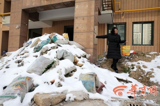 “現在就有個別設施還沒完工,基本都竣工了。”老胡說,但樓門口堵著的垃圾堵了他們收房裝修的路,也堵住了他們入住新房的喜悅。
