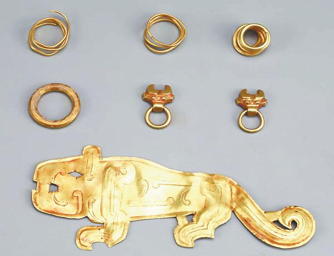 一是鉆探確認(rèn)了墓地的范圍與墓葬數(shù)量,了解了墓葬形制與墓地布局特點(diǎn)。墓地總面積約7700平方米,共發(fā)現(xiàn)墓葬56座,車馬坑2座,馬坑1座。特別引人注目的是兩座“中”字形大墓(編號(hào)M1與M2),東西并列分布,居于墓地中部偏東處。二是對墓地進(jìn)行全面發(fā)掘,2017年共發(fā)掘墓葬20座,出土了銅、金、鐵、石、玉等材質(zhì)的器物。墓葬多使用木質(zhì)棺槨葬具,墓主人頭向多朝北,仰身直肢。根據(jù)墓葬及隨葬品特征判斷,其年代為春秋早期或略偏晚階段。三是通過周邊區(qū)域系統(tǒng)調(diào)查,找到了與墓地年代相匹配的兩處居址遺存,包括有陶窯、灰坑、板瓦堆積及陶器殘片,以及一處由夯土和壕溝組合成的面積10余萬平方米的核心區(qū)域。根據(jù)采集陶器與板瓦的特征判斷,兩處居址的年代為春秋早中期前后。