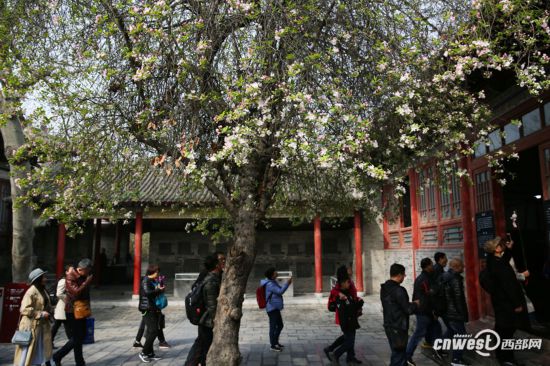 3月21日,游人穿過花海,進入展室看如林碑石。這個季節(jié),庭院深深的碑林博物館處處是花,春意盎然。