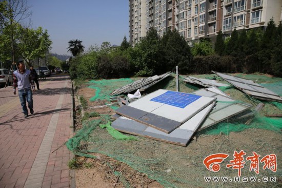 4月9日上午,華商報記者在小區(qū)正門東側綠化帶看到,有一片地已被平整出來,施劃了白線。根據圍擋上的“工程概況”,施工單位受雁塔區(qū)城管局委托,準備在這里建設“渡塵閣公廁工程”,工期為90天。