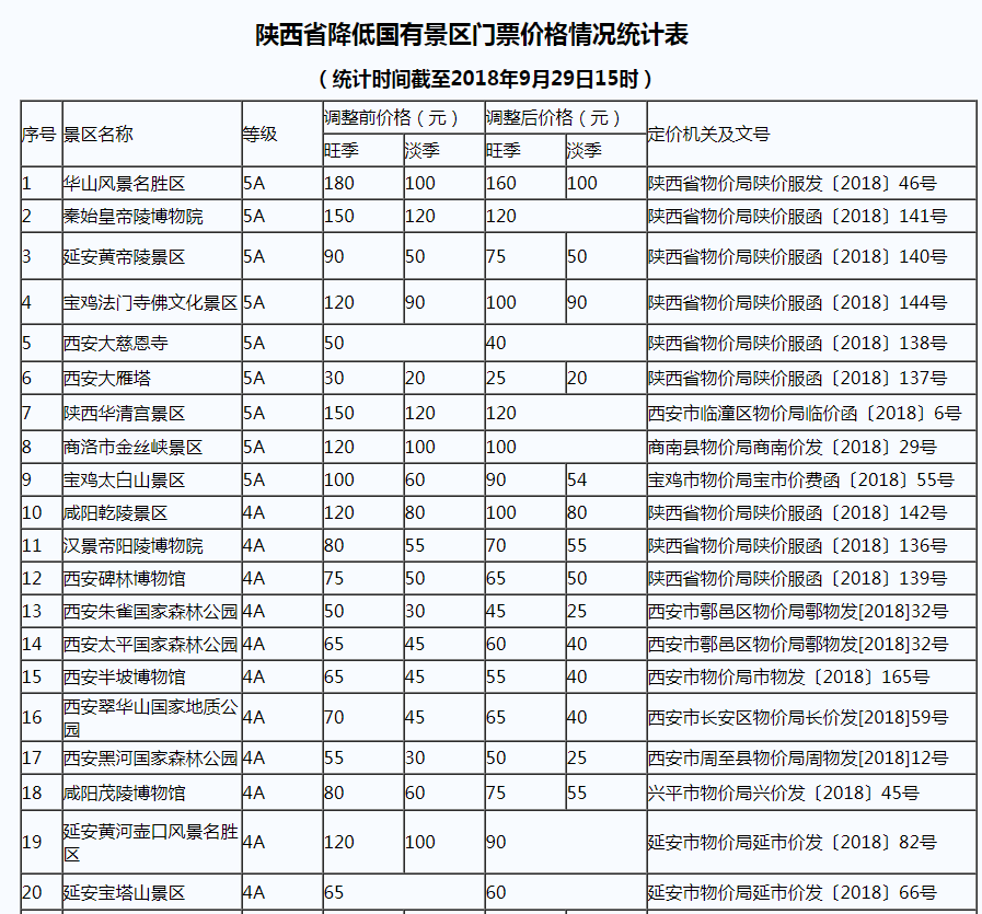 記者9月29日從陜西省物價(jià)局官方網(wǎng)站了解到,“十一”黃金周前夕,陜西省秦始皇帝陵博物院、華清宮、法門寺、黃帝陵、大雁塔、大慈恩寺、乾陵、漢陽陵、西安碑林博物館、陜西牛背梁國家級(jí)自然保護(hù)區(qū)等一批國有旅游景區(qū)門票價(jià)格下調(diào),降價(jià)幅度在10%至20%之間。