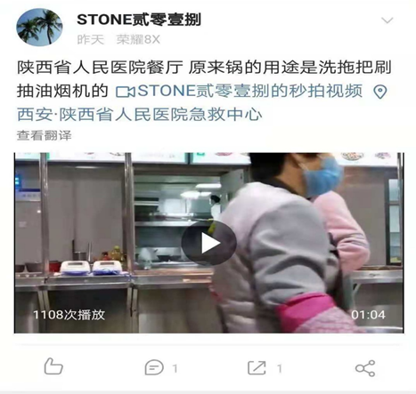 11月6日14:50,“西安直播”等微博號轉(zhuǎn)發(fā)網(wǎng)友爆料:“11月5號,在西安市某醫(yī)院食堂內(nèi),清潔人員站在灶臺上在打掃油煙機上的污漬時,竟直接把清潔油煙機的拖把放到灶臺上的鍋里清洗,絲毫不避諱外面的食客。目前,餐廳方面對此還未作出回應(yīng)。”此視頻同時被“新浪財經(jīng)”、“深圳商報”等多個媒體官微點名轉(zhuǎn)發(fā)。