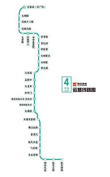 線路依次貫穿西安航天基地、曲江新區(qū)、雁塔區(qū)、碑林區(qū)、未央?yún)^(qū)、經(jīng)濟(jì)技術(shù)開發(fā)區(qū),途經(jīng)西安北站、大明宮國家遺址公園、火車站、五路口、大雁塔、大唐芙蓉園、曲江池遺址公園等人流密集區(qū),全線設(shè)車站29座,均為地下站,設(shè)航天城車輛段1座,草灘停車場1座。開通初期因西安火車站改造,故該站甩站運(yùn)行,各次列車不停站通過。按照現(xiàn)行票價政策,四號線全程票價為8元。