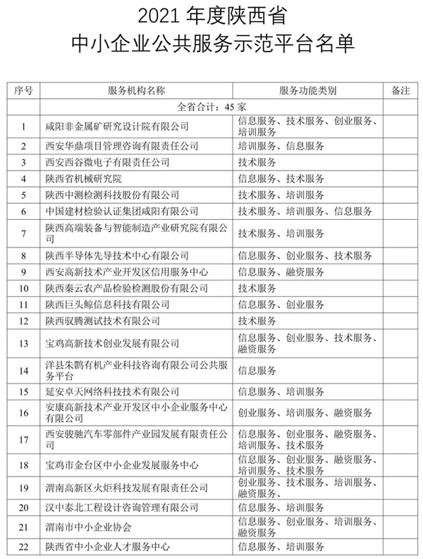 附件:2021年度陜西省中小企業(yè)公共服務(wù)示范平臺(tái)名單