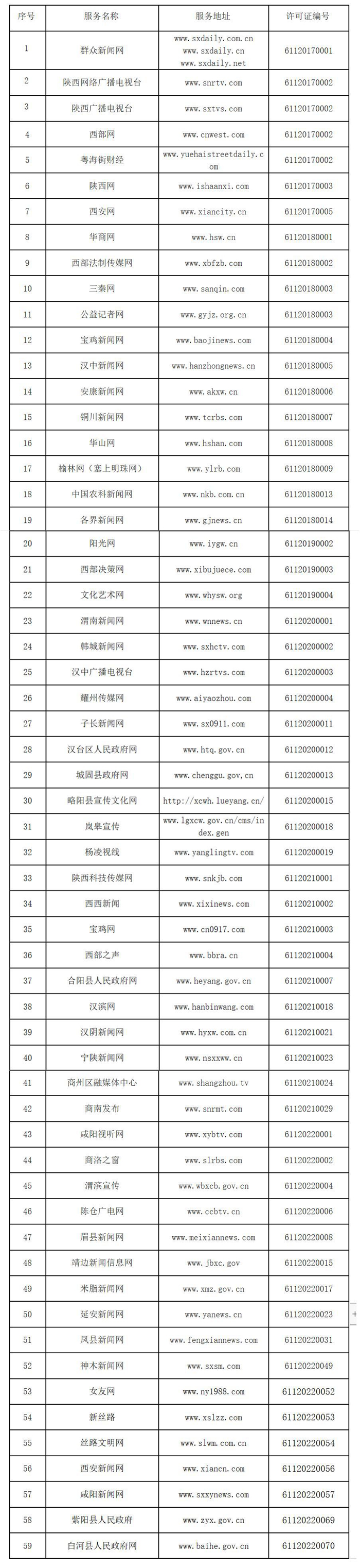《互聯(lián)網(wǎng)新聞信息服務(wù)管理規(guī)定》實(shí)施以來,陜西省網(wǎng)信辦按照國家互聯(lián)網(wǎng)信息辦公室統(tǒng)一工作部署,組織開展屬地互聯(lián)網(wǎng)新聞信息服務(wù)許可審批工作,F(xiàn)將陜西省互聯(lián)網(wǎng)新聞信息服務(wù)單位相關(guān)許可信息予以公開,包括:服務(wù)主體136個,互聯(lián)網(wǎng)站59個,應(yīng)用程序130個,論壇2個,公眾賬號299個,共計490個服務(wù)項(xiàng)。