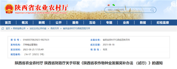 第二十二條 本辦法自2023年10月1日起施行(2022年度取得的成果參照本辦法執(zhí)行),有效期2年,待陜西農(nóng)作物育種創(chuàng)新能力和種子企業(yè)競(jìng)爭(zhēng)力得到明顯提升后,補(bǔ)助政策將逐步退出。