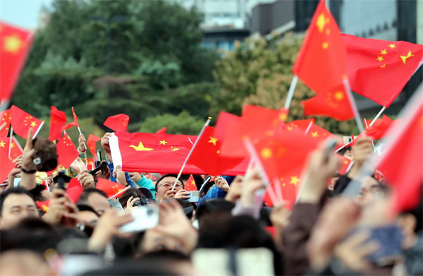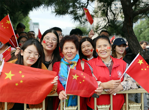 隨后,在《歌唱祖國(guó)》的奏樂(lè)中,人們揮舞著手中的國(guó)旗,盡情唱響愛(ài)國(guó)贊歌,表達(dá)愛(ài)國(guó)之情。