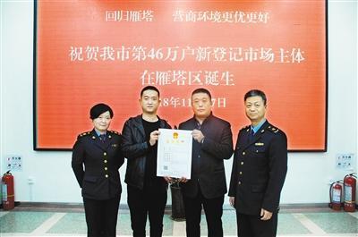 西安市工商局雁塔分局向新登記的第46萬戶市場主體頒發(fā)營業(yè)執(zhí)照 原標題:今年西安新登記市場主體突破46萬戶 今年以來,西安市各級各部門深入開展“行政效能革命……
