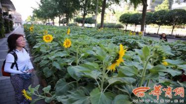 原標(biāo)題:西安南大街驚現(xiàn)一片向日葵花海 昨日,在西安南大街上擺放的向日葵,引來蜜蜂采蜜、市民拍照。這片向日葵花海有百米長、寬三四米,中間留出一條……
