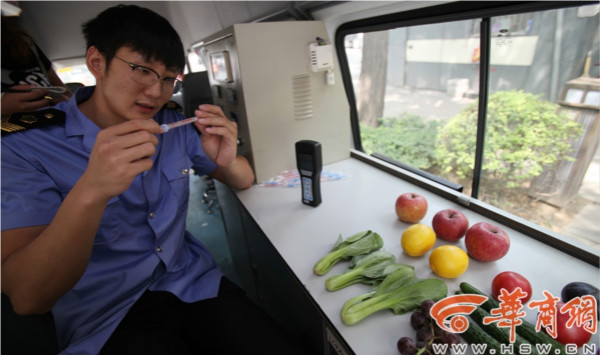 西安市雁塔區(qū)食品藥品監(jiān)督管理局,工作人員正在對(duì)水果表皮上的潔凈度進(jìn)行檢測(cè)。華商報(bào)記者 黃利健 攝買來(lái)的水果直接用清水洗就可以吃了嗎?哪種方式清洗水果最好……