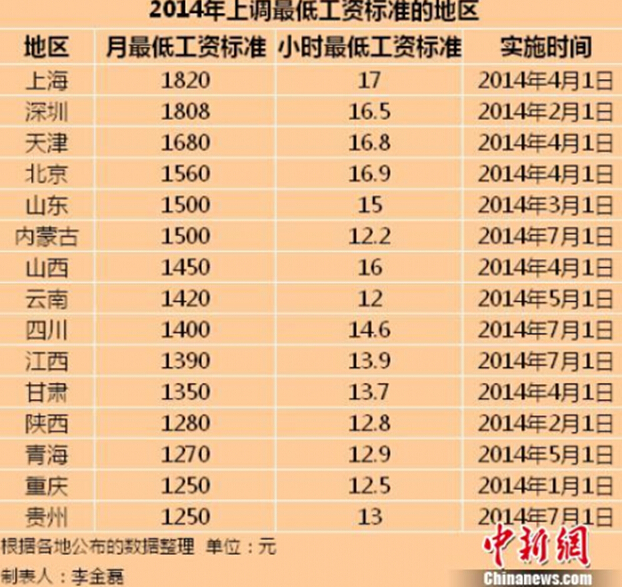 15地公布2014年最低工資標準 陜西1280排倒數(shù)第四