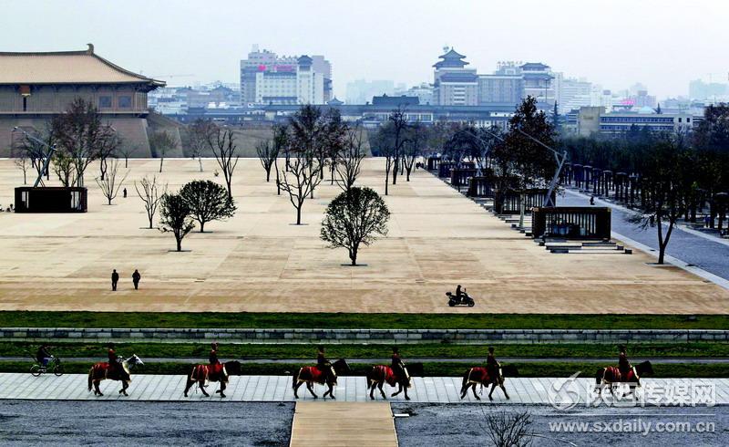 一列馬隊(duì)從西安的大明宮遺址公園的含元殿遺址前經(jīng)過(2011年12月7日攝)。6月22日,中國與吉爾吉斯斯坦、哈薩克斯坦聯(lián)合提交的“絲綢之路:長安—天山廊道路……