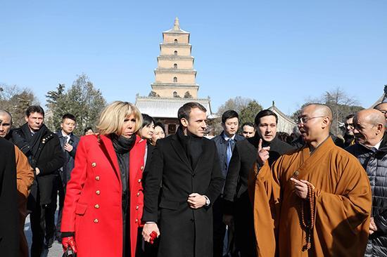 “參觀完兵馬俑后,馬克龍總統(tǒng)一行趕往大雁塔!标惓空f。中國佛教協(xié)會(huì)副會(huì)長、陜西省佛教協(xié)會(huì)會(huì)長、大慈恩寺方丈增勤法師陪同馬克龍總統(tǒng)一行參觀了大雄寶殿,并登上大雁塔;監(jiān)院道宏法師為其介紹了大慈恩寺及大雁塔的歷史傳承和玄奘法師西行求法的精神。分析人士表示,馬克龍此次選擇大慈恩寺、大雁塔作為主要參觀點(diǎn),是因?yàn)槠渑c“絲綢之路”的密切關(guān)系,也表明了馬克龍希望傳遞出歐洲和中國將在“一帶一路”建設(shè)的框架內(nèi)加強(qiáng)合作的信號(hào)。