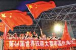 圖為日前在阿拉伯聯(lián)合酋長(zhǎng)國(guó)舉行的第44屆世界技能大賽開幕式上,人們揮舞著中國(guó)國(guó)旗歡迎中國(guó)代表團(tuán)入場(chǎng)。