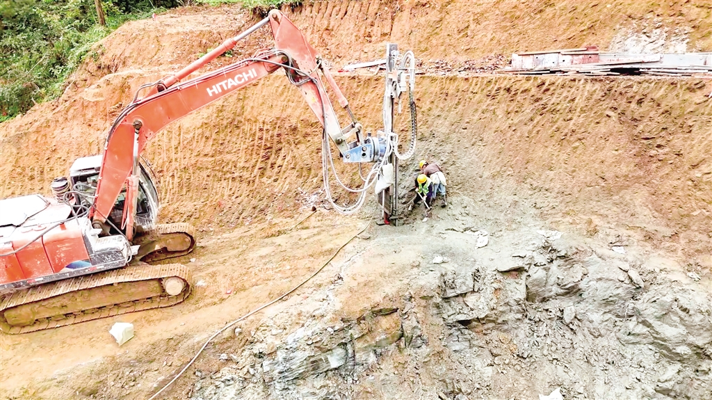 在鳳凰山隧道引線工程(進(jìn)口段)項(xiàng)目建設(shè)現(xiàn)場(chǎng),機(jī)器轟鳴,挖掘機(jī)揮舞著鏟斗挖掘土石,運(yùn)輸車(chē)輛往來(lái)穿梭,配合默契。工人們鉚足干勁,爭(zhēng)分奪秒搶抓工期,現(xiàn)場(chǎng)一派熱火朝天的施工景象。